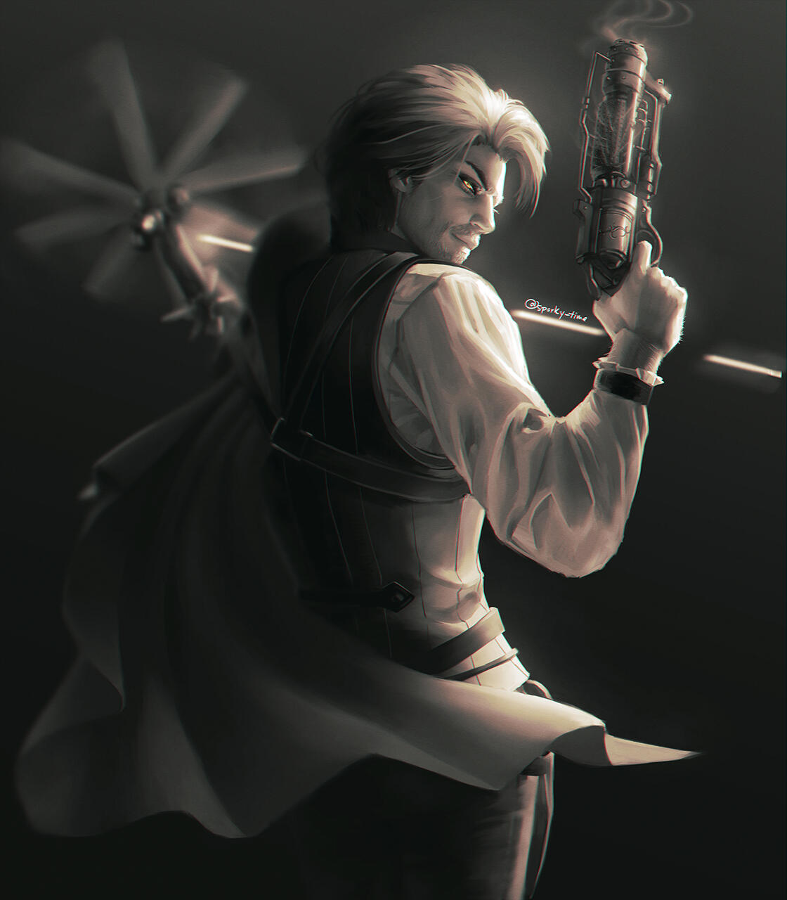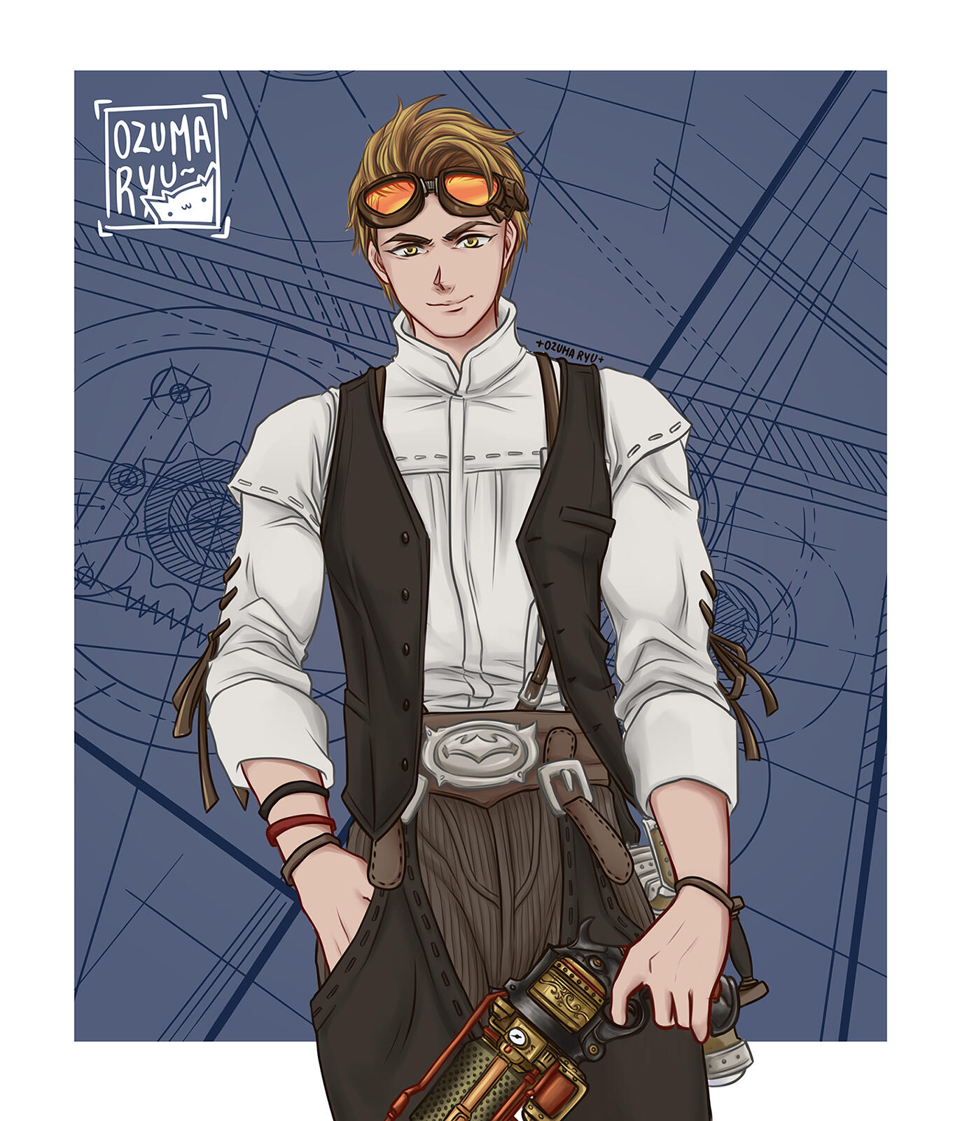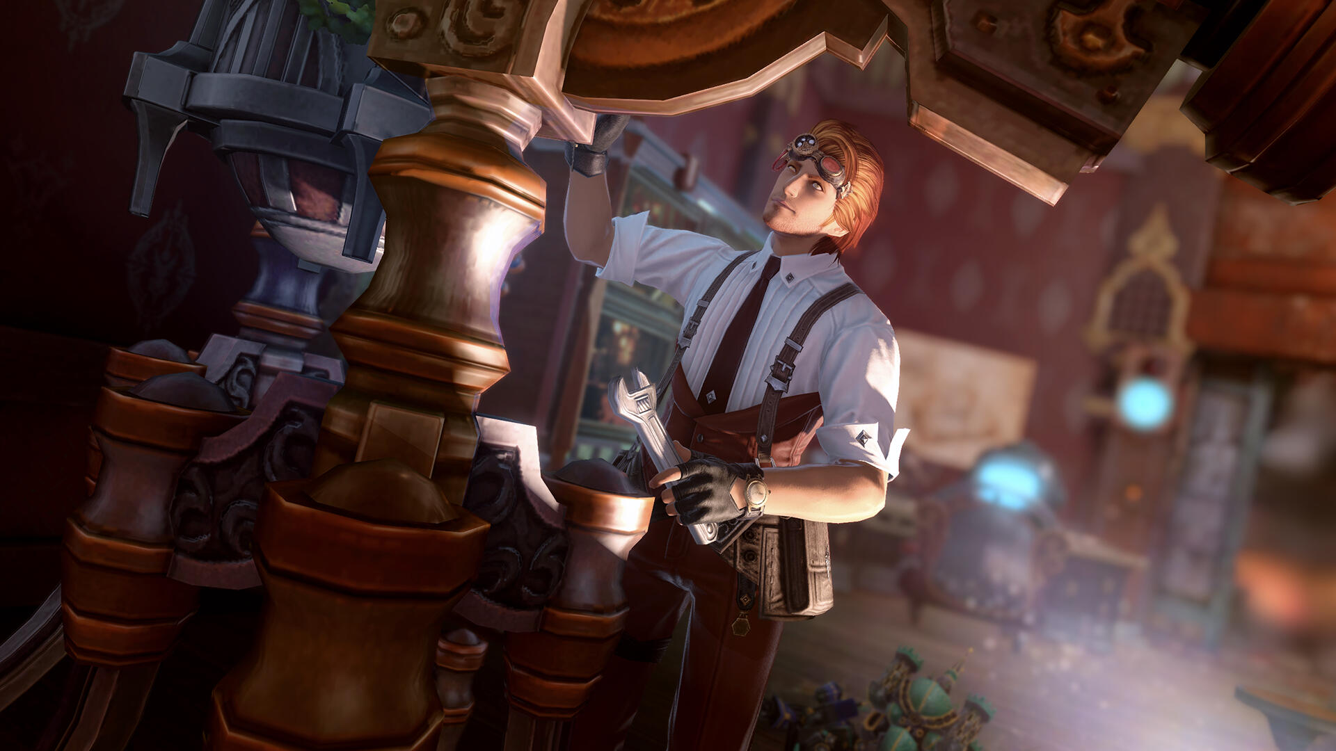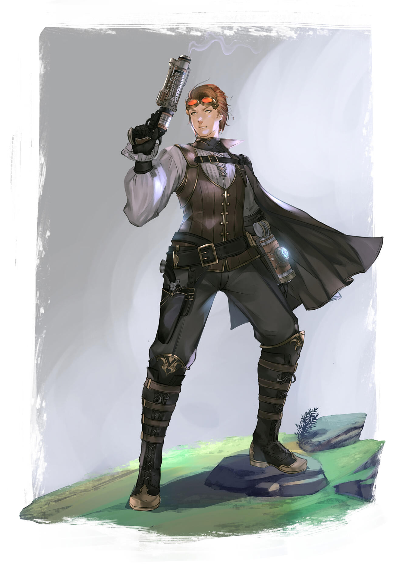 You know a piece of land is worthless when none of Eorzea’s territory-hungry city-states can be bothered to claim it.Such was long the case with the Carteneau Flats. A peninsula on the west coast of Aldenard situated southwest of Mor Dhona and northwest of Thanalan, Carteneau could at best have been called “nowhere” even before the Calamity. Yawning steppes of dense, untillable ground yielded little in the way of vegetation apart from the odd gnarled tree or reedy scrub. Unforgiving mesas and latholiths of rock littered the terrain like vast tombstones and sarcophagi. Nauseous beasts and monsters roamed free, unmarked by any soldier’s eye. The great nations saw little profit in annexing this remote, blighted territory, and so it lay for hundreds of cycles, with no human residents.…So the official records of the city-states allege. But while the Flats were a dangerous challenge to human life, they were not uninhabitable… and wherever men may survive, they will inevitably settle. What’s more, those who would elude the outstretched palm of the tax collector or the watchful gaze of the lawman may find any lawless land irresistible, no matter how treacherous.Thus it was that unknown to most Eorzeans and disregarded by the rest, a sprinkling of huts, hovels, and tiny enclaves secreted themselves amid the cliffs and outcroppings of Carteneau, lingering out of sight of the world for generations, too few in number for any government to trouble itself with.The jewel of these settlements, if such a term could be unironically applied, was Brazemoor, a spacious, low-slung manor house built into the concave side of a mesa half a malm from the Cinderfoot River. Brazemoor was built by and was the ancestral home of the Raskes, a noble family of Hyur Midlanders dedicated to the pursuits of science and invention.Unlike most of the scattered residents of the peninsula, the Raske family chose the Flats as their home not to escape the law or the treasury—though in their endeavors they certainly benefited from the absence of both—but instead to reap a unique harvest.The family had chanced to discover a secret that was lost to every other soul in the realm until the end of the Seventh Umbral Era: an immeasurable wealth of ancient Allagan technological artifacts, buried beneath Carteneau’s intractable plains and scarpments. Everything from tiny parts and trinkets to large, sophisticated machines at whose purpose one could only guess lay waiting to be unearthed, holding the amassed knowledge of the most advanced civilization ever known.In addition to creating new devices from scratch as they always had done, the family discreetly excavated sites around the Flats and utilized what they found in a number of their inventions… recycling, retrofitting, and reverse-engineering the relics to create more advanced machines and gadgets. A Raske device gradually came to be coveted by many highly placed individuals in the city-states, unrivaled by any other both in form and in function. In this way the family grew modestly wealthy, and moved freely about the higher echelons of Eorzean society when they traveled forth from Brazemoor with their wares.The peninsula was prowled by dangerous creatures and occasionally by bandits and speculators, and the absence of a government also meant the absence of a peacekeeping force. Cartenuvians quickly learned to defend themselves, and in this too the Raskes developed unsurpassed skill and ingenuity. The arts of gunplay and machinistry were barely more than theory in those days, but the Raskes built and used their own firearms, teaching all of their children marksmanship and the construction of guns, turrets, and other defensive weaponry. As a noble clan they also trained extensively in the combat arts of gentlemen, such as boxing and fencing, and even employed some light magecraft. With these abilities at their disposal, they were able to fight and defend Brazemoor from any monsters, raiders, or rivals who would seek to lay waste to what the family had built.Alas, men and women so absorbed in their work tend not to be prolific in the act of expanding the bloodline. By the time of the Garlean invasion and Dalamud’s descent, the house was inhabited by just four people: the heads of the household, Vertus and Edwina Raske, their teenaged son, Ramius, and their paid servant, I'bensho Tia.As soon as it became clear that the Carteneau Flats would be the staging ground both for the battle against Garlemald and for the lesser moon’s impact, most Cartenuvians began to flee north into Mor Dhona or to cross the Cinderfoot into Northern and Central Thanalan. Vertus and his wife gave custody of Ramius over to I'bensho and commanded him to flee with the boy northward by sea, up the Strait of Merlthor and across the Indigo Deep and the Bloodbrine Sea to Old Sharlayan, where their only son would be safe at least from the Garleans.However, they themselves refused to cede Brazemoor. The family had defended it for generations, it was Ramius’ birthright, and both father and mother agreed that they would be thrice damned if they would surrender it now: not to the Alliance, not to the Empire, and not to the Dreadwyrm. At Brazemoor they would remain, and protect the estate from any force that would attempt to rob them of what their ancestors had built.Neither the son nor the servant were in a position to dissuade them from such folly. And so, as the smoke lifted from the Seventh Umbral Calamity and the world began to take stock and to rebuild, no further word arrived at Sharlayan from the manor upon Carteneau.Ramius returned at last to Brazemoor five cycles later, having enrolled at the Studium and honed his own craft among the Sharlayans in the intervening time. He had long since had word of his parents’ demise, and the devoted family servant had passed some five moons prior. The rage of Bahamut had reduced the manor to mostly rubble. Some portion of the structure remained intact